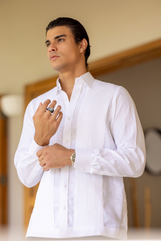 En cuanto al algodón italiano se destaca su suavidad al tacto, así como su durabilidad, otro elemento clave en las creaciones de Lagares. Su versatilidad permite que las chacabanas o guayaberas se adapten tanto a eventos formales como a momentos relajados.